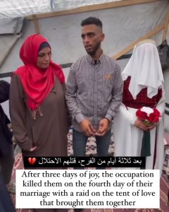ووفقا لوسائل إعلام فقد استشهد عبد الله ومريم اللذان ضجت مواقع التواصل الاجتماعي بصور زفافهما في قطاع غزة، وذلك بقصف “إسرائيلي” استهدف استراحتهما بمدينة رفح عقب ثلاثة أيام من عقد قرانهما.